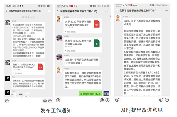 自学校2月8日发布“延期开学、线上教学、创新模式、保证质量”的新学期教学工作安排以来,学院严格按照学校要求,第一时间研究学院教学工作实际,部署学院新学期教学工作。2月9日发布《民航/飞行学院关于做好2020年春季学期教学的通知》,成立工作小组,对线上教学、实验教学、毕业设计等教学活动做了详细和周密的安排。明确实施负责人制度,布置教学办、各系主任、辅导员工作任务,确保协同高效完成各项工作。