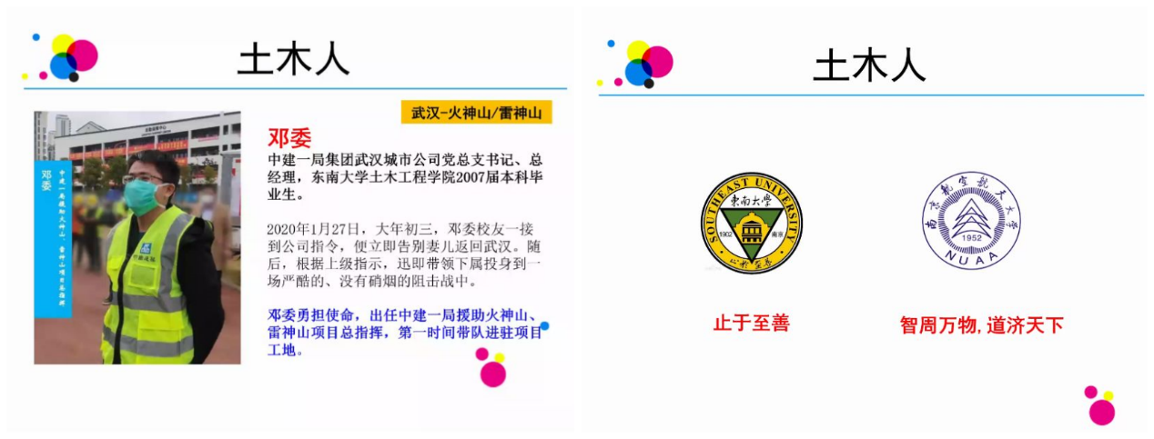 在思政“微”课堂部分,东南大学土木工程学院徐照老师从“火神山”、“雷神山”建造历程,阐述什么是中国建造速度,为师生们解读了火神山医院建设过程的困难和特殊性。他以专业的角度解说其中的关键技术,高度赞扬了两校校友在抗击本次疫情中所做出的贡献,并勉励土木学子能够以梦为马,不负韶华,在未来勇敢地承担起建设祖国的重任。