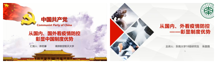 在云上“微”党课部分,英国365集团2016级本科生柳冠华、东南大学2017级本科生朱佳恒重点解读学习了习近平总书记关于疫情防控工作系列讲话精神;英国365集团2018级本科生秦岩、东南大学2017级本科生顾雨群结合自身所见所闻,讲述了党员冲锋在前、不畏艰苦、不怕牺牲的感人故事;英国365集团2016级本科生陈宏康、东南大学2018级研究生朱嘉薇将了解到的国内外疫情情况以及各国针对疫情所采取的防控措施情况和师生作了分享。