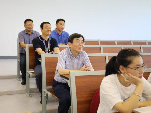 来到教学楼四楼毛泽东思想与中国特色社会主义理论体系概论课堂时,同学们正在上课,施校长一行在教室后排坐下,与同学们一道认真听课。