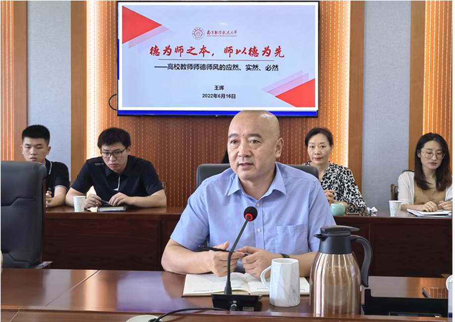 最后,王晖介绍了我校师德师风建设的工作思路及主要成果,并以“热爱”和“敬畏”两个关键词为着眼点,和老师们分享了自己关于“好老师”的思考,作为新时代高校教师,要热爱工作、关爱学生,要敬畏教师身份、严守师德师风底线。