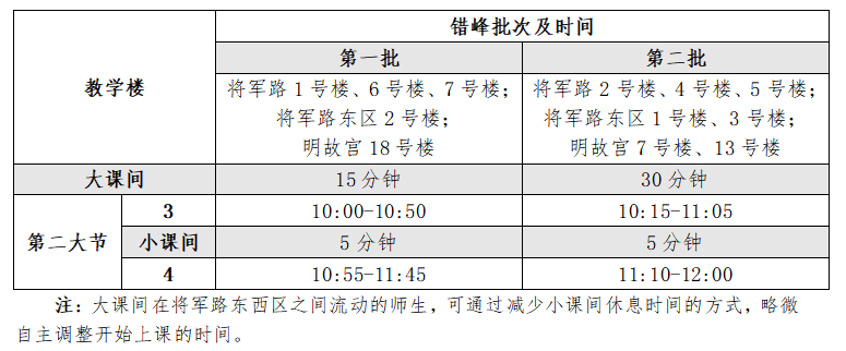 根据学校疫情防控总体要求,现结合学校实际情况,对将军路、明故宫校区上午第3、4节课的上下课时间进行调整,实行两批错峰上下课。新方案自2022年9月26日(周一)起实施,具体安排如下: