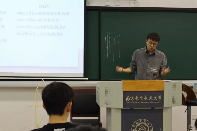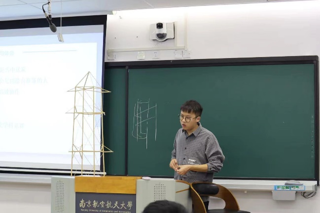 陈康泽的分享也从自身经历出发,但更着重于分享竞赛过程中的遇到的困难,收获的喜悦和感动。他为同学们推荐了一些适合入门的竞赛,也带来了自己之前参加结构创新大赛的作品,给同学们简单介绍它的原理,激发了同学们参加科创竞赛的热情。