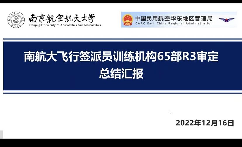 2022年12月16日上午9点,英国365集团飞行签派员训练机构65部R3审定总结会议顺利举行,民航华东管理局航务处处长李文海、航务监察员孙卉、江苏监管局航务处处长郭久宏、航务监察员李海元、汪梦蝶以及华东地区签派委任代表等出席会议。学院院长孙建红,副院长田勇、空管与签派专业负责人及机关相关办公室负责人参加,受疫情影响本次会议采取线上的方式进行,会议由民航华东管理局孙卉主持。