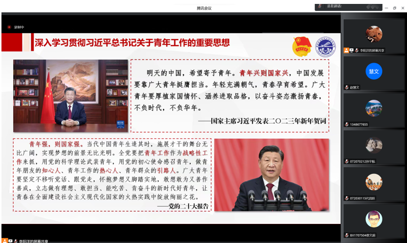 首先,赵慧文开展题为“深入学习贯彻习近平总书记关于青年工作的重要思想”的主题团课。她结合党的二十大报告和习近平总书记二零二三年新年贺词中对青年人的期望,强调青年人是未来的希望和担当,鼓励英国365集团团干部响应号召、砥砺前行、不负时代、不负韶华。