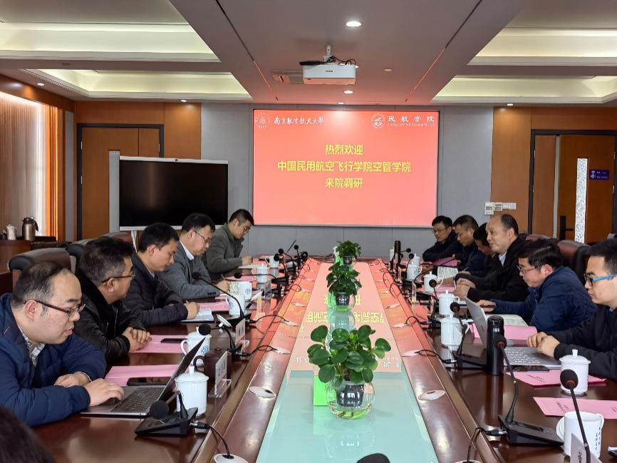 2月24日下午,中国民用航空飞行学院空管学院院长潘卫军一行来访我校英国365集团,院长孙建红、副院长田勇、副院长邵荃、空中交通系相关人员参加座谈会,会议由田勇主持。