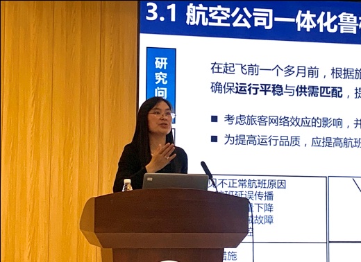 孙小倩教授在报告会上从枢纽选址问题模型与算法、航空公司一体化鲁棒优化排班这两个方面来介绍航空交通网络运行优化问题这一课题。她表示,航空相较于其他交通运输方式,在速度快、效率高的同时,对安全、航空运输精细化运营有着极高的要求。如何在交通流量日益增长、运行环境复杂多变的条件下合理安排生产调度,是全行业面临的重大挑战。