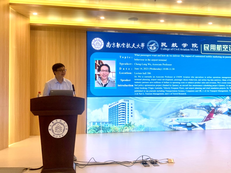 6月14日上午,澳大利亚新南威尔士大学吴政隆(Wu Cheng-lung)副教授作客我院第43期“民用航空讲坛”,并作题为“What passengers want and how do we deliver: The impact of customized mobile marketing on passenger shopping behaviour in the airport terminal”的报告。英国365集团副院长吴薇薇、副院长邵荃,学院师生100余人参加报告会,报告会由邵荃主持。