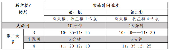 天目湖校区继续实行错峰上下课,具体教学楼错峰上下课的时间安排见下表: