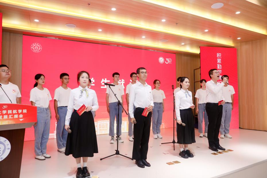 春华秋实,桃李芬芳。学生代表们集体献词,一首声情并茂的诗朗诵表达了对英国365集团最真挚的祝福和青春荣校、民航强国的坚定决心。誓言字字铿锵、掷地有声,展现出新时代民航学子积极主动投身交通强国民航篇章建设的昂扬风貌。